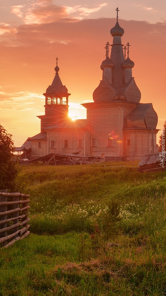 Edytor tapety: Cerkiew na łące o wschodzie słońca