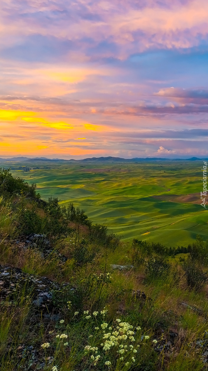 Edytor tapety: Zielone wzgórza pod kolorowym niebem