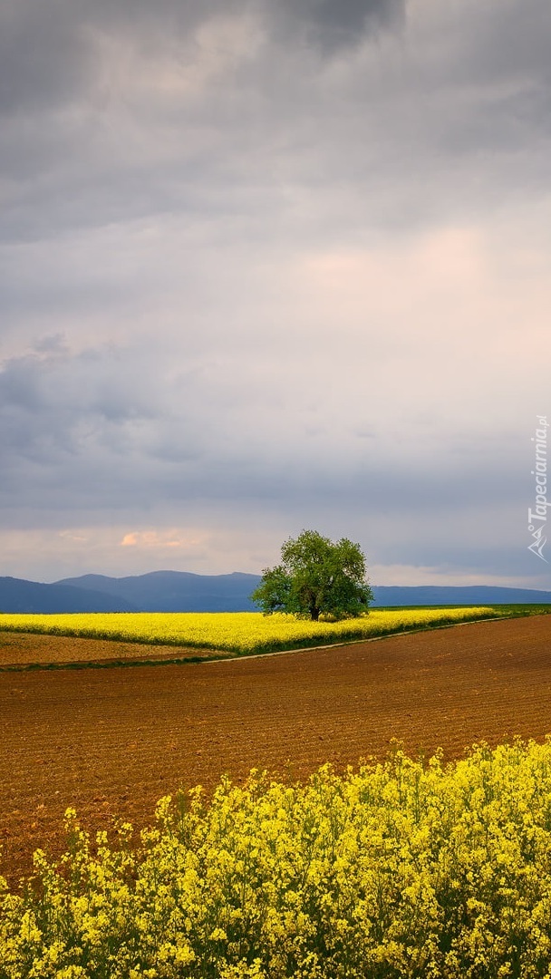 Edytor tapety: Zielone drzewo na polu rzepaku