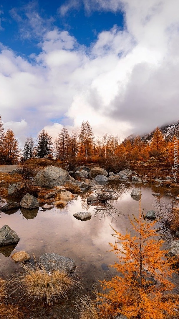 Edytor tapety: Jesienne drzewa i kamienie nad wodą