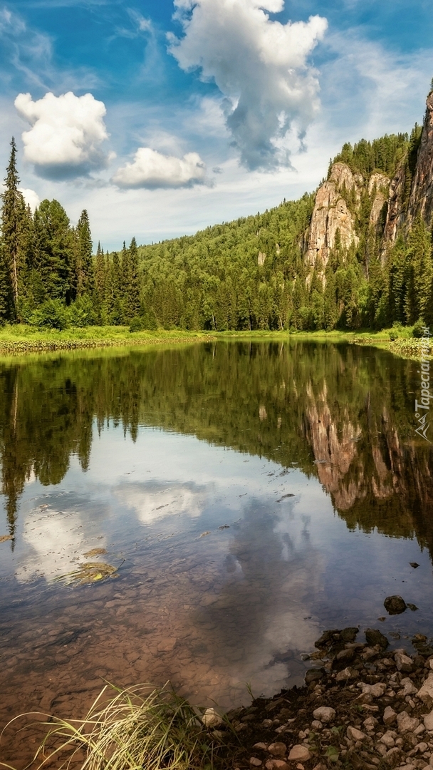 Edytor tapety: Drzewa i skały nad jeziorem