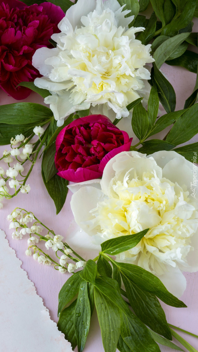 Edytor tapety: Konwalie obok białych i różowych piwonii