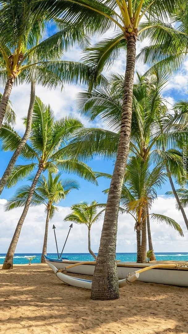Edytor tapety: Łódka i palmy na morskiej plaży