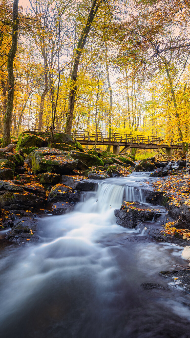 Edytor tapety: Pożółkłe drzewa przy moście na rzece