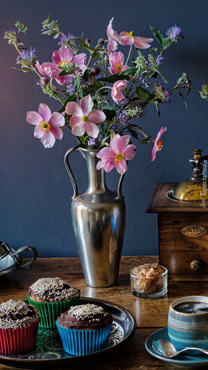 Edytor tapety: Babeczki obok bukietu kwiatów w wazonie