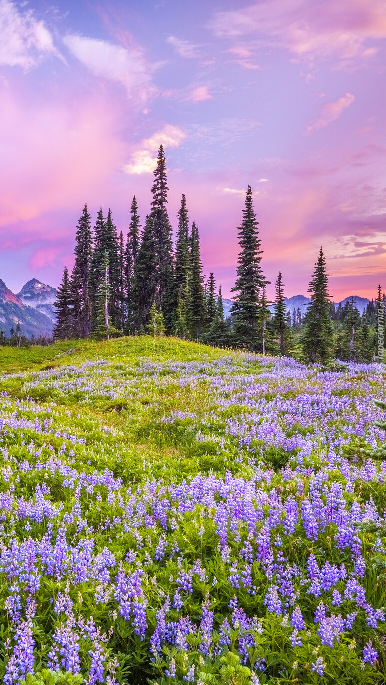 Edytor tapety: Zaróżowione niebo nad górska łąką