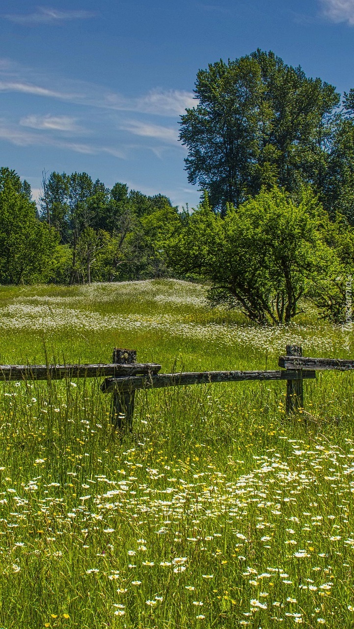 Edytor tapety: Drzewa i ogrodzenie na ukwieconej łące