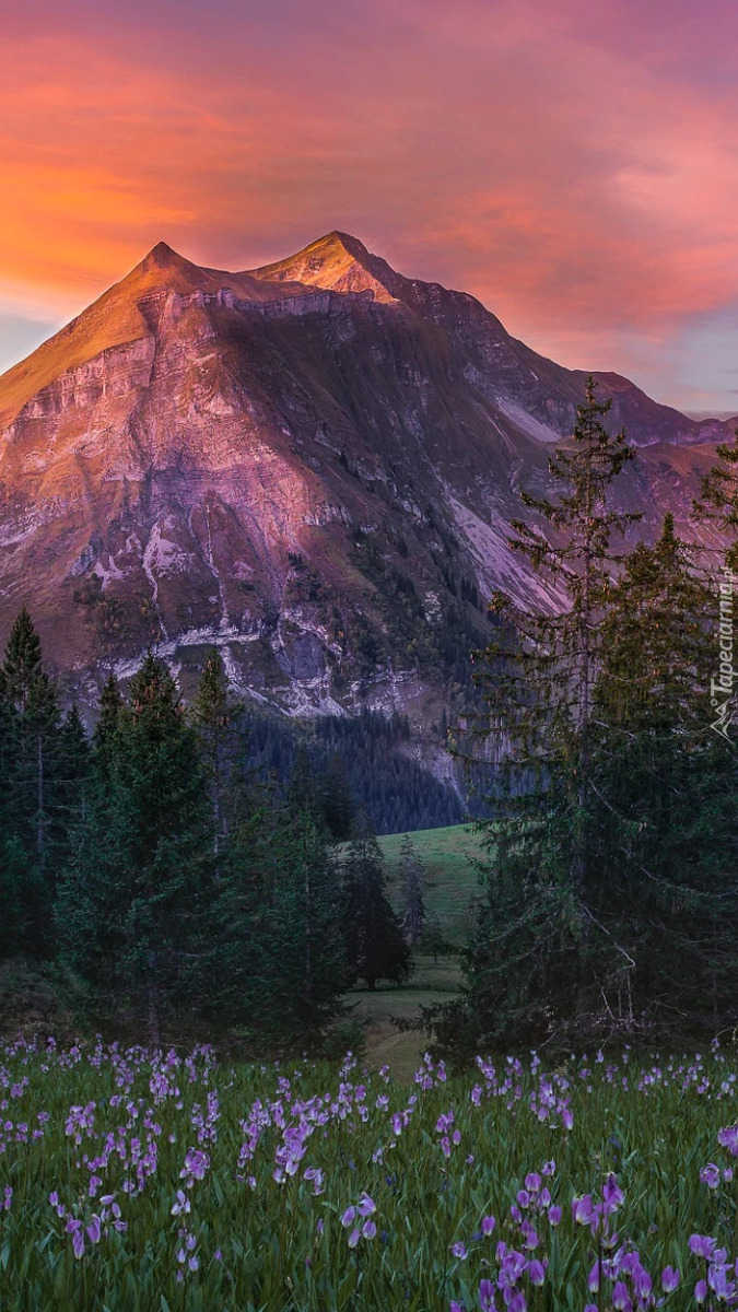 Edytor tapety: Łąka i góry pod kolorowym niebem