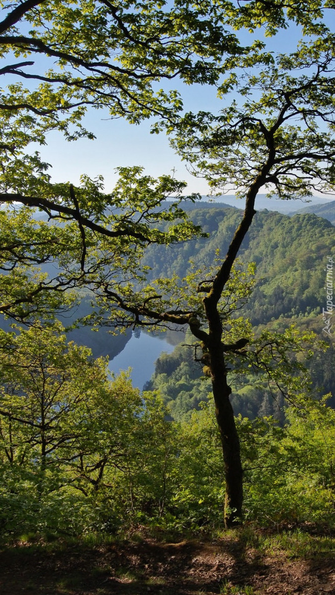 Edytor tapety: Drzewa na wzgórzu nad rzeką
