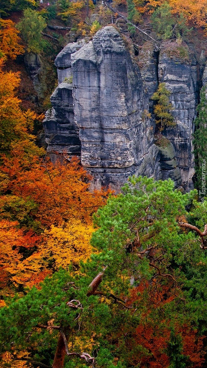 Edytor tapety: Jesienne drzewa przy skałach