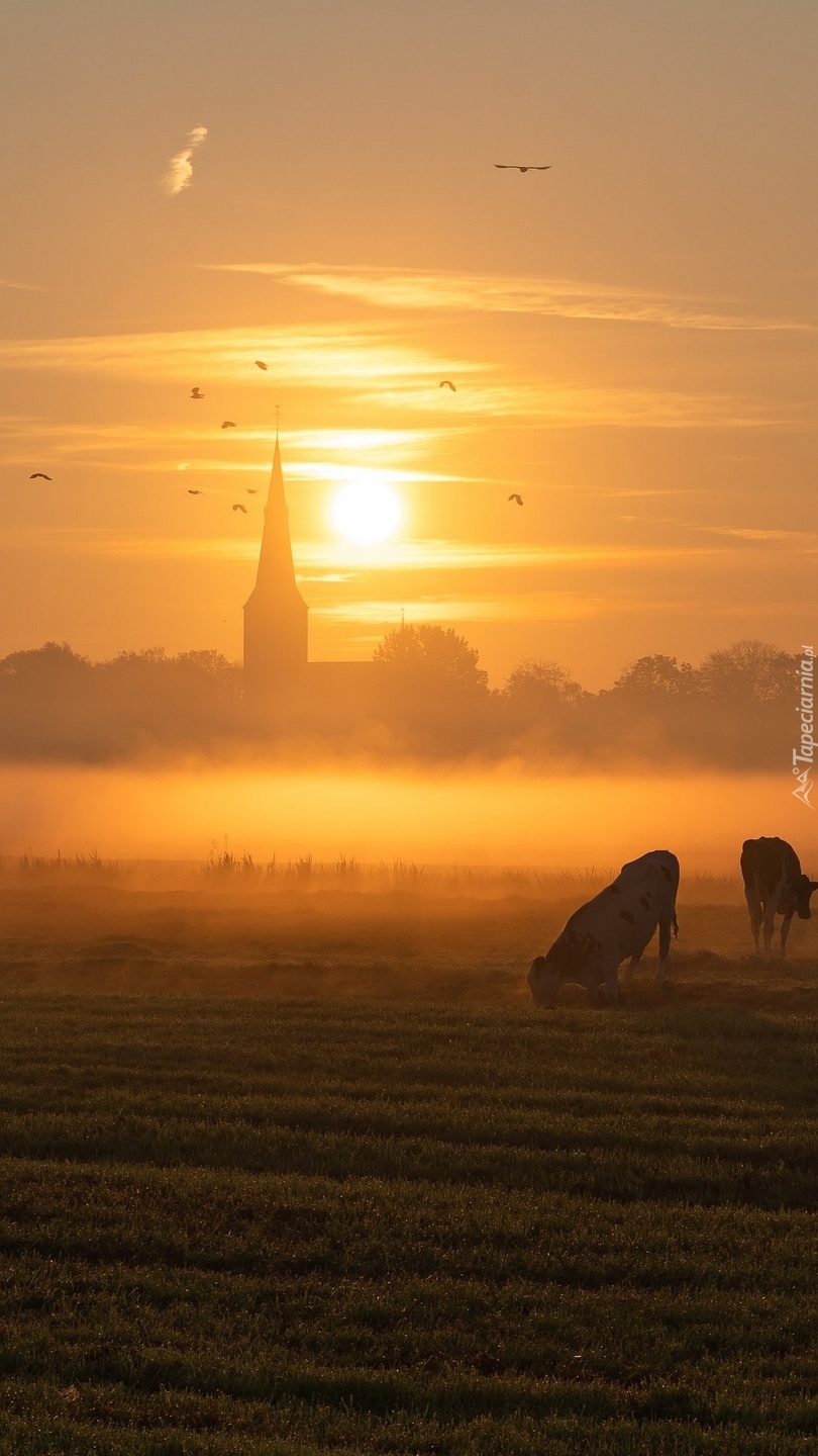 Edytor tapety: Zachód słońca nad zamgloną łąką