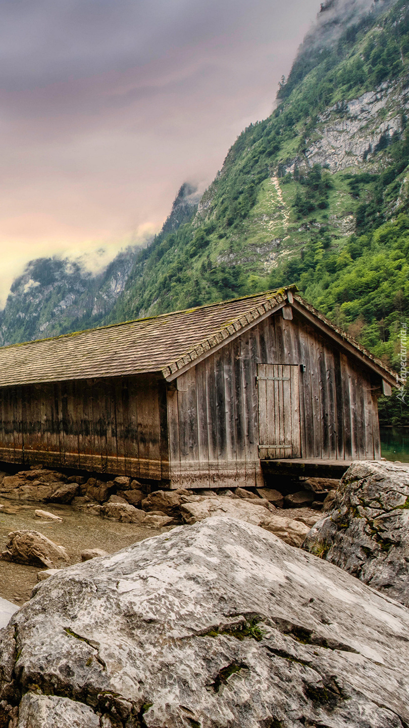 Edytor tapety: Drewniany domek na tle Alp