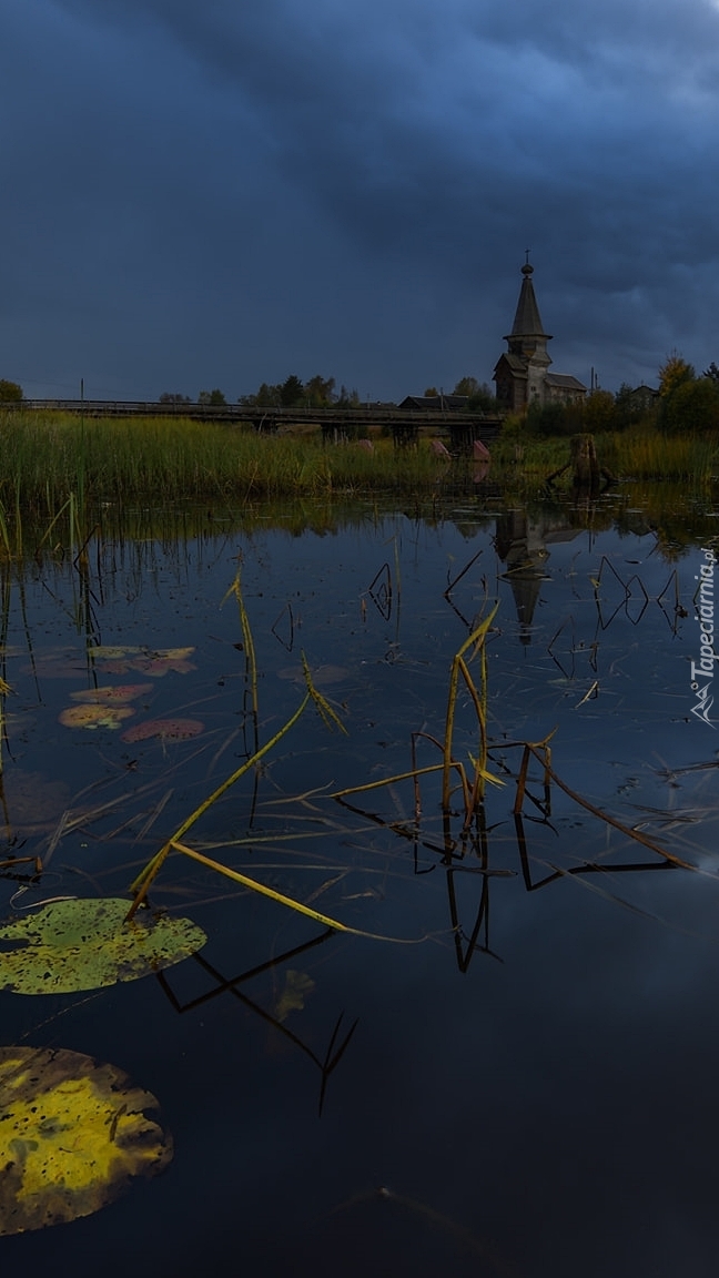 Edytor tapety: Zachmurzone niebo nad cerkwią i jeziorem
