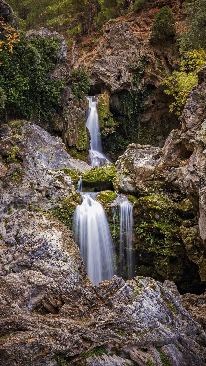 Edytor tapety: Drzewa przy skalistym wodospadzie