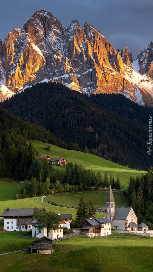 Edytor tapety: Wieś Santa Maddalena i rozświetlone Dolomity