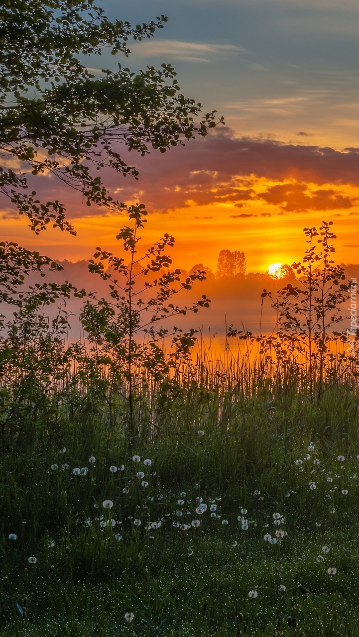 Edytor tapety: Wschód słońca nad zamglonym jeziorem