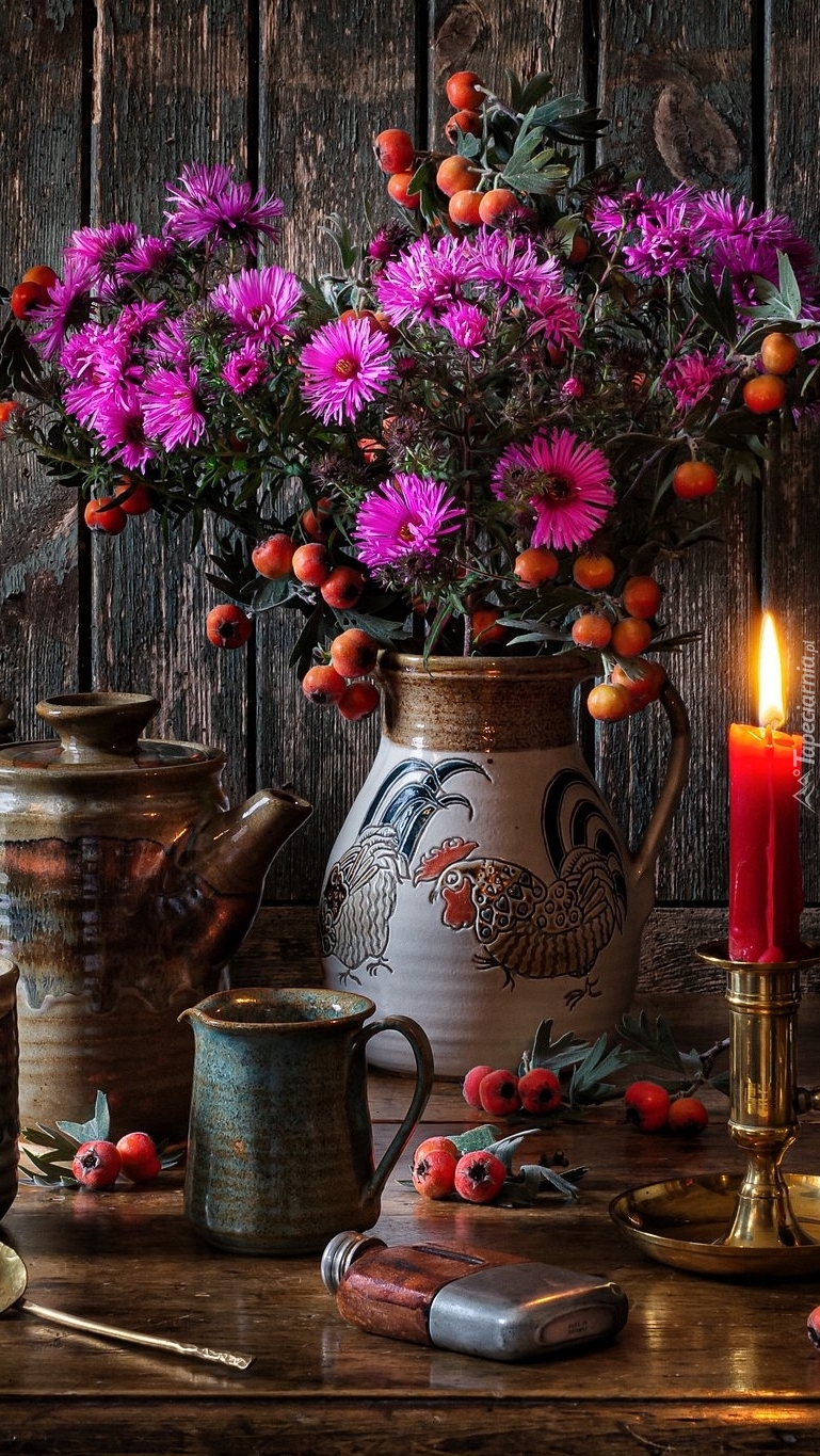 Edytor tapety: Świeca obok astrów w wazonie