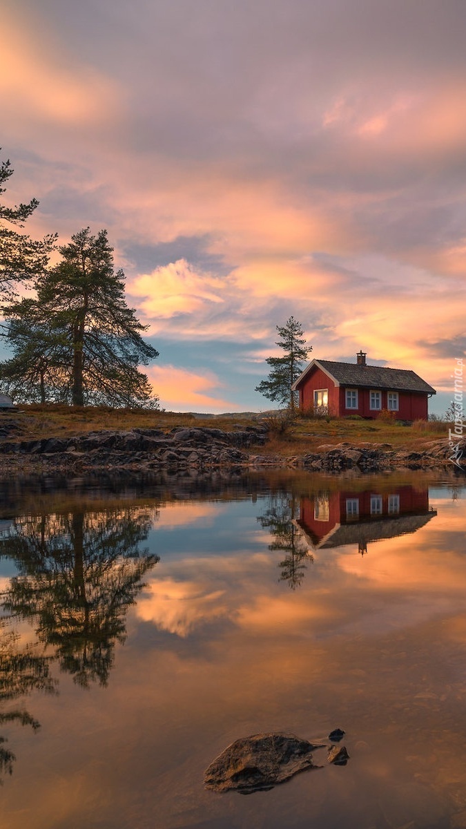 Edytor tapety: Czerwony domek nad norweskim jeziorem Vaeleren