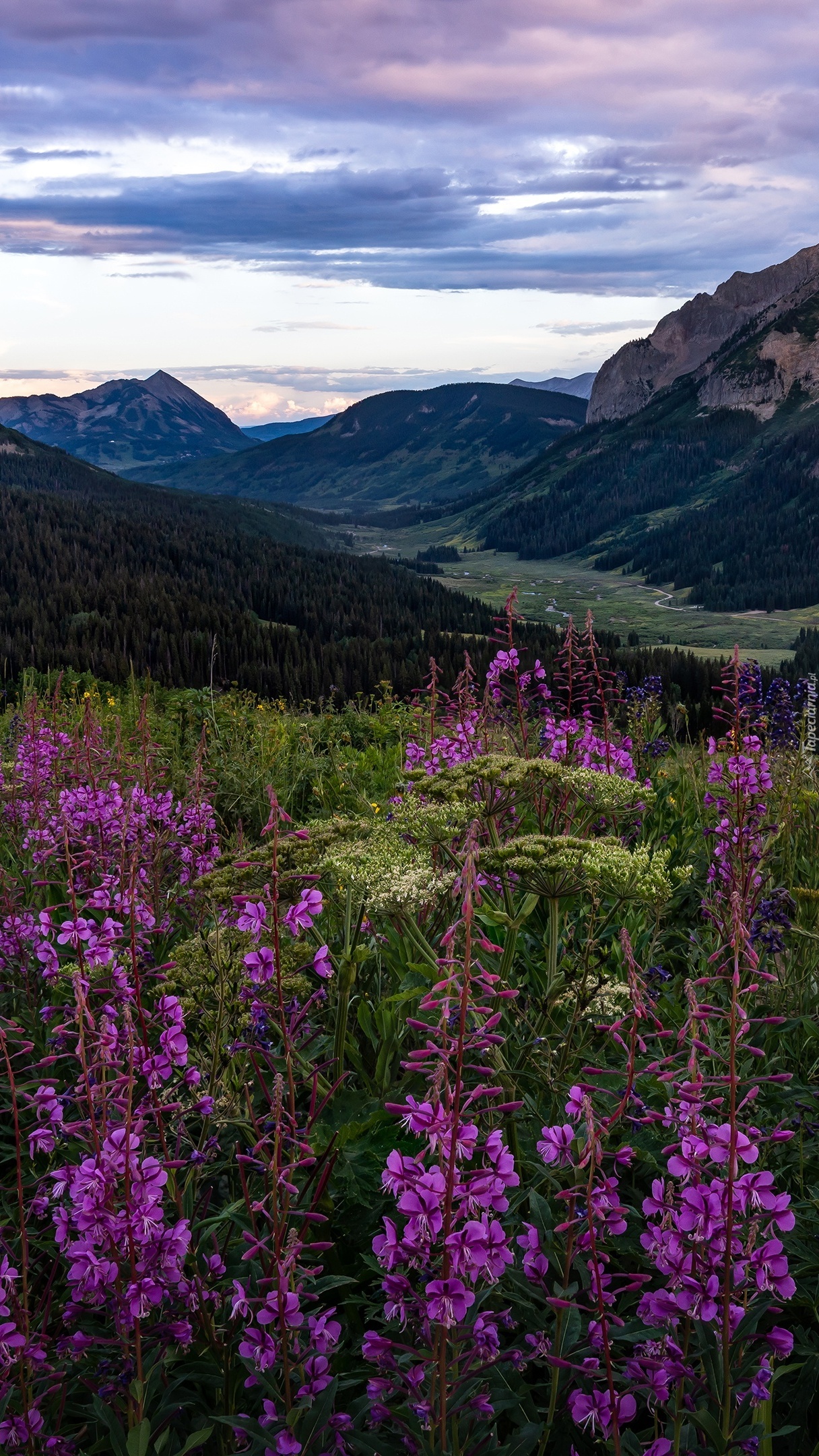 Edytor tapety: Widok z okwieconej łąki na góry