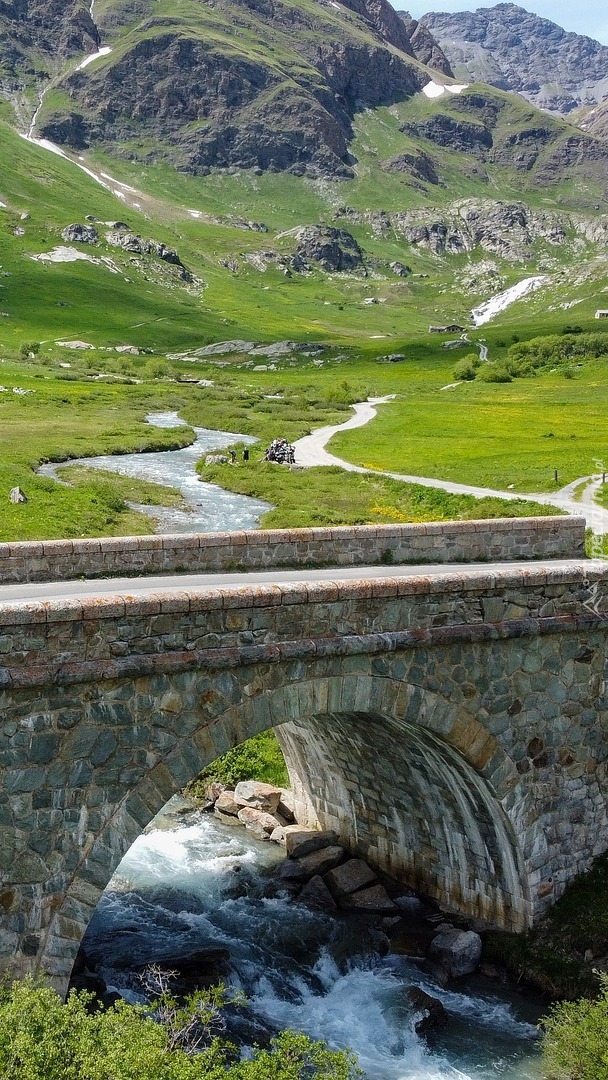 Edytor tapety: Kamienny most nad rzeką w dolinie