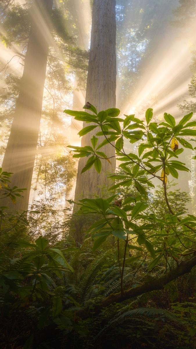 Edytor tapety: Przebijające wśród sekwoi słoneczne światło