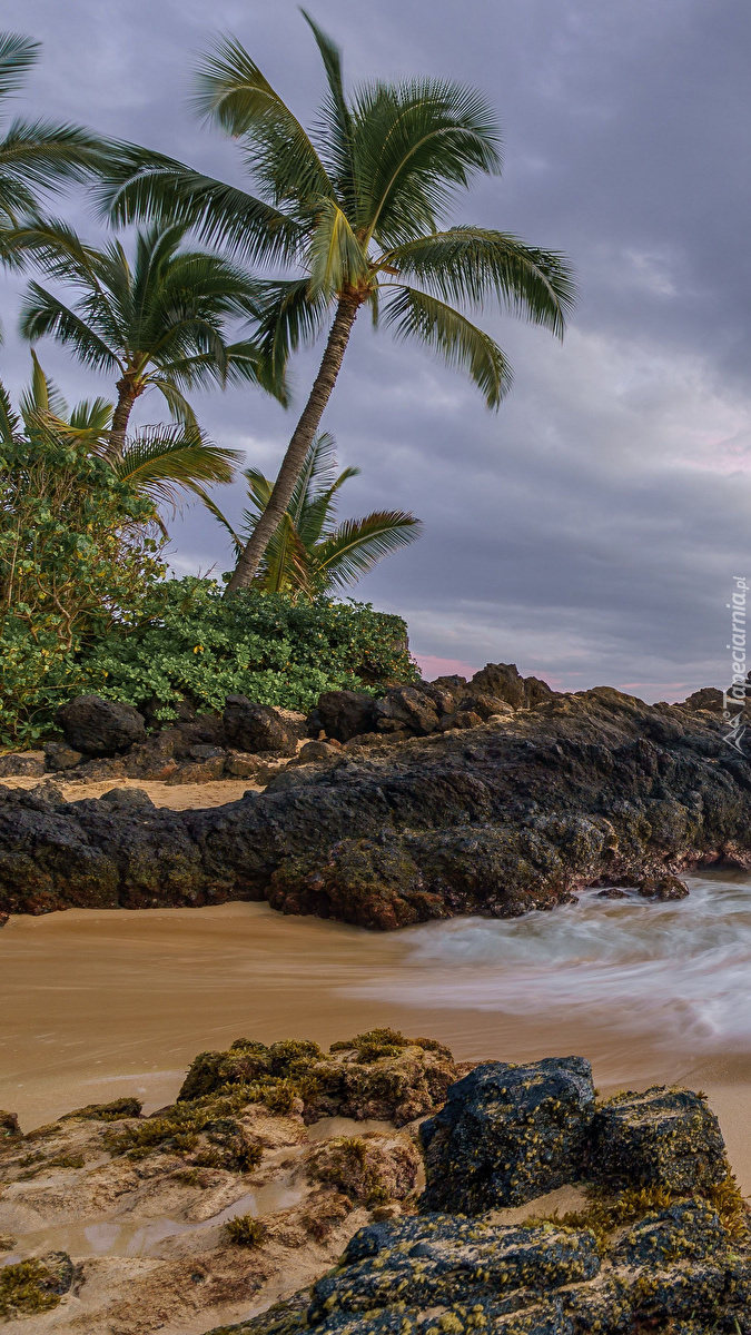 Edytor tapety: Palmy i skały na wybrzeżu morza