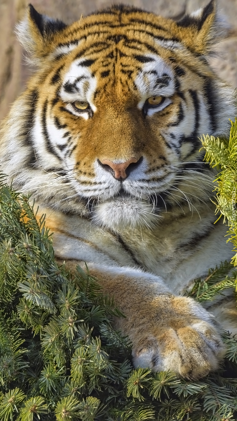 Edytor tapety: Głowa tygrysa pośród świerkowych gałązek