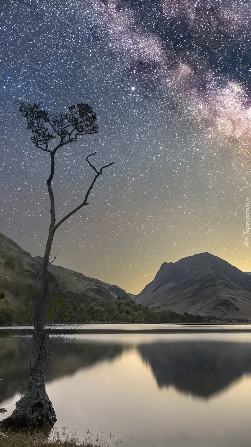 Edytor tapety: Jezioro w górach pod rozgwieżdżonym niebem