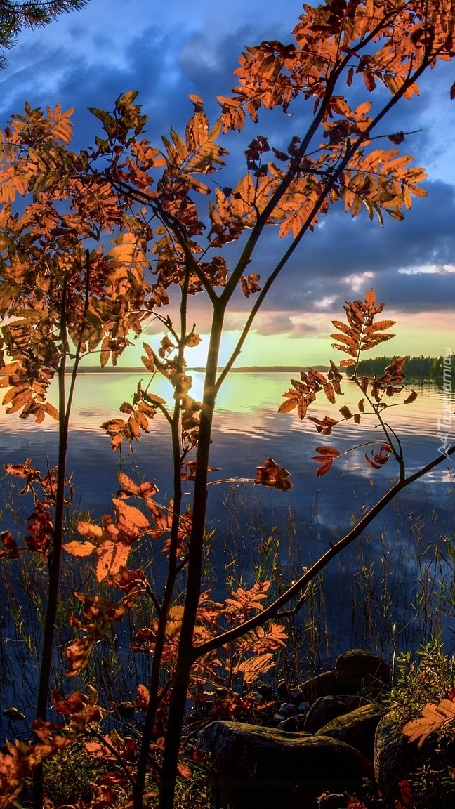 Edytor tapety: Rozświetlone jesienne drzewa nad jeziorem