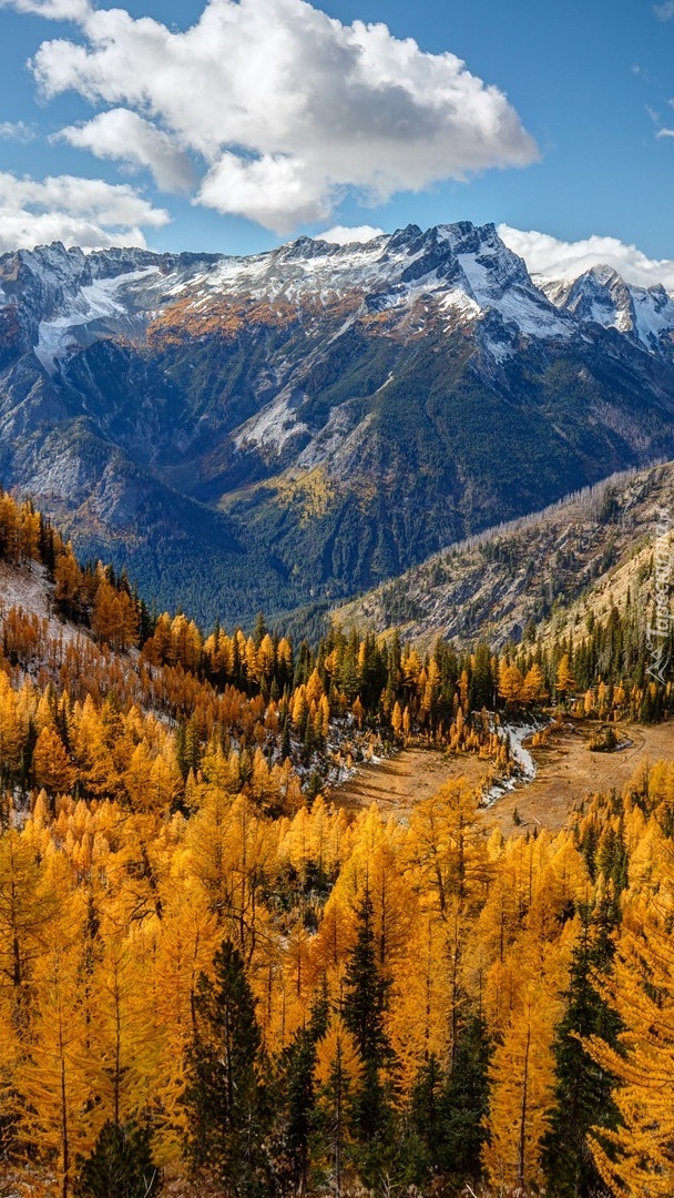 Edytor tapety: Pożółkłe modrzewie na tle gór