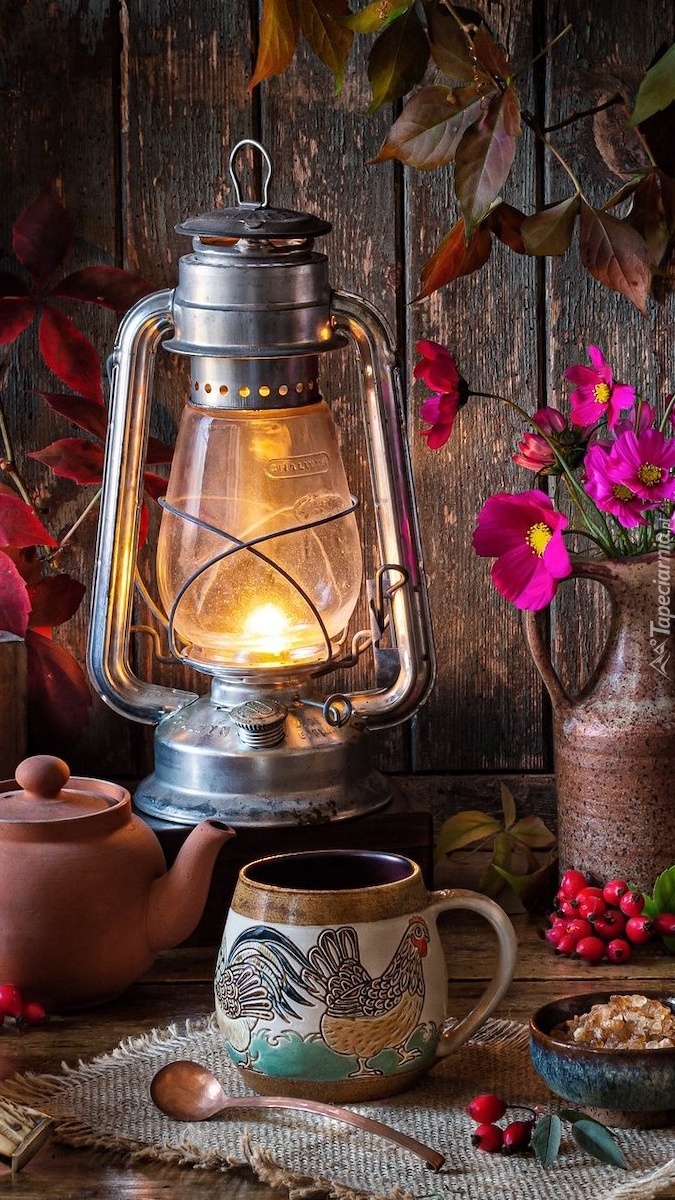 Edytor tapety: Czajniczek i kubek obok lampy