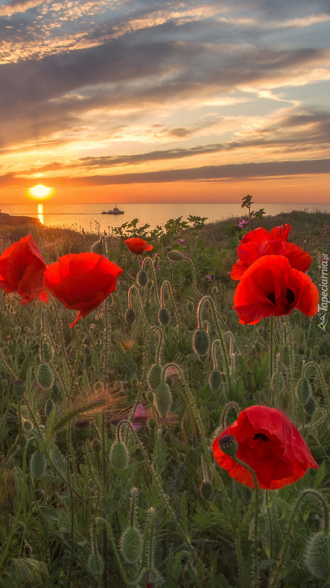 Edytor tapety: Czerwone maki w blasku zachodzącego słońca