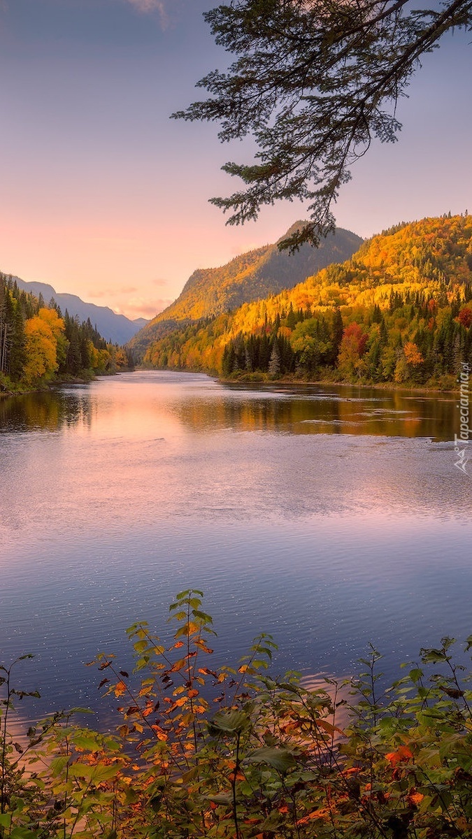Edytor tapety: Rozświetlone zalesione góry nad jeziorem