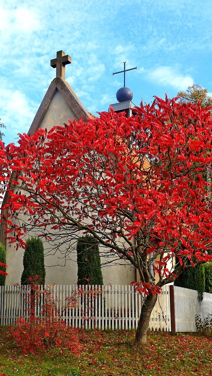 Edytor tapety: Sumak octowiec przy ogrodzonym kościółku
