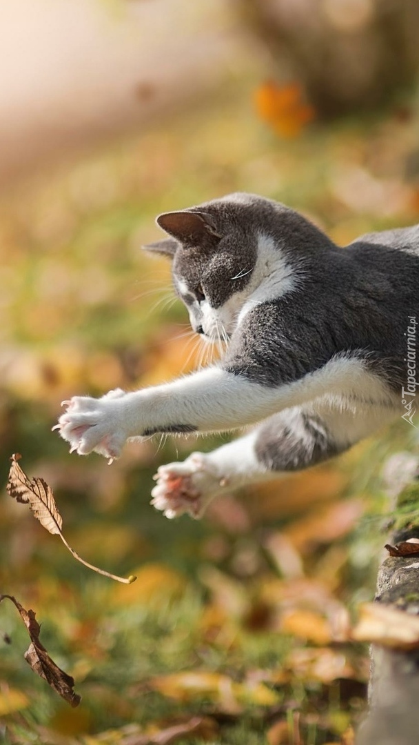 Edytor tapety: Zabawa kota z jesiennym liściem