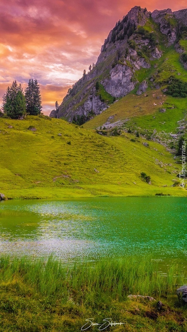 Edytor tapety: Kolorowe niebo nad jeziorem Bergsee