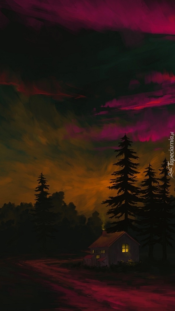 Edytor tapety: Zorza polarna nad domem i drzewami