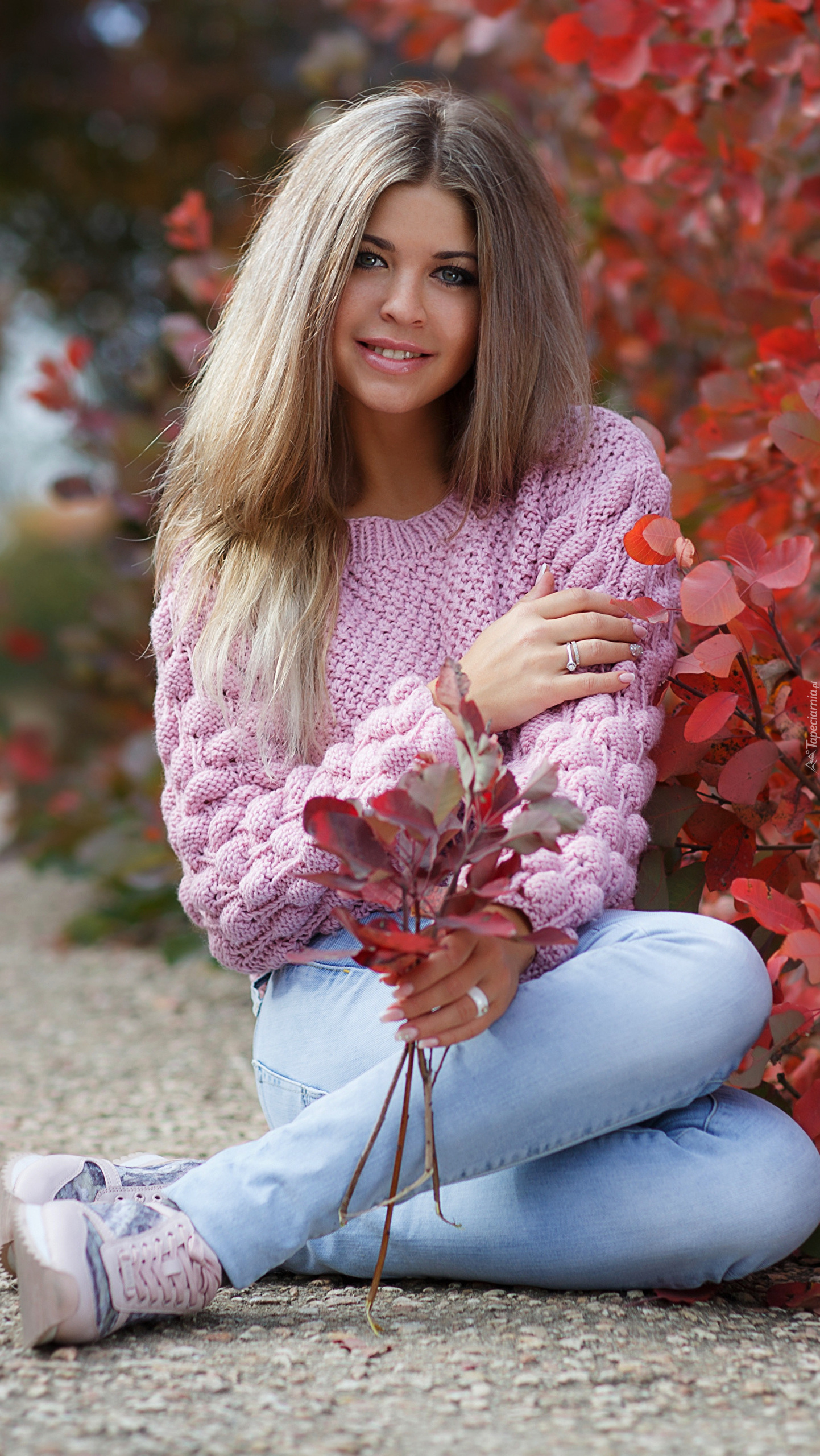 Edytor tapety: Blondynka obok krzewu z czerwonymi liśćmi