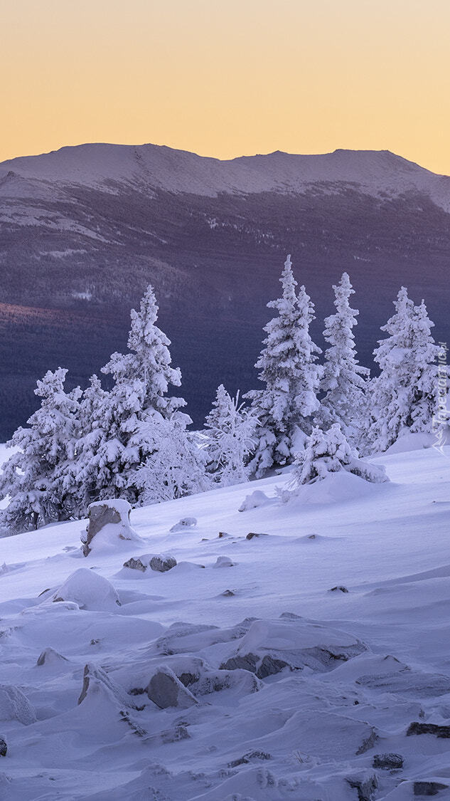 Edytor tapety: Zasypane śniegiem drzewa na tle gór