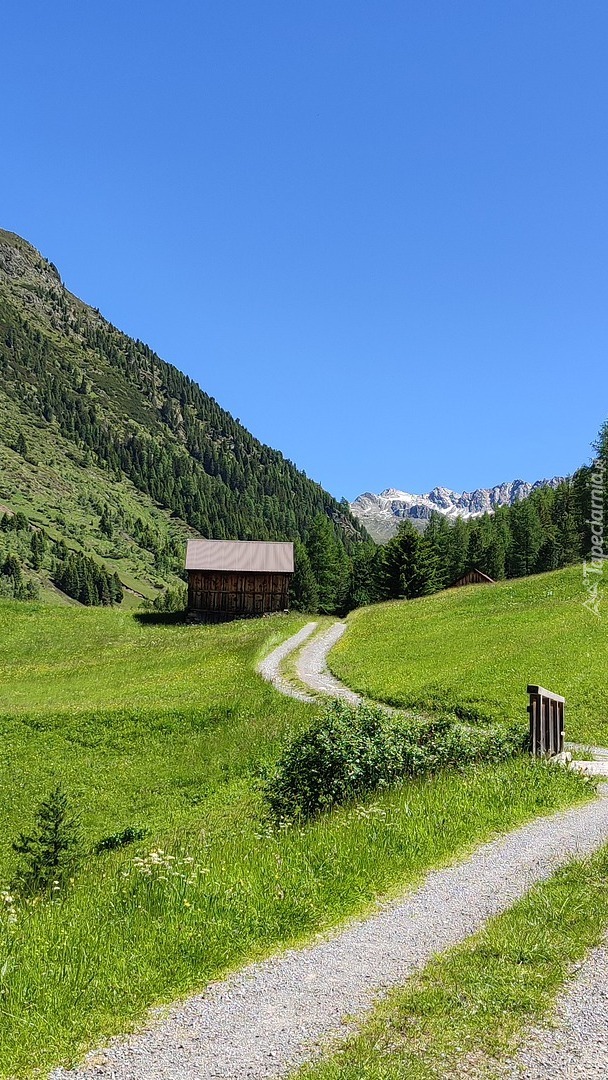 Edytor tapety: Dom przy polnej drodze w górach