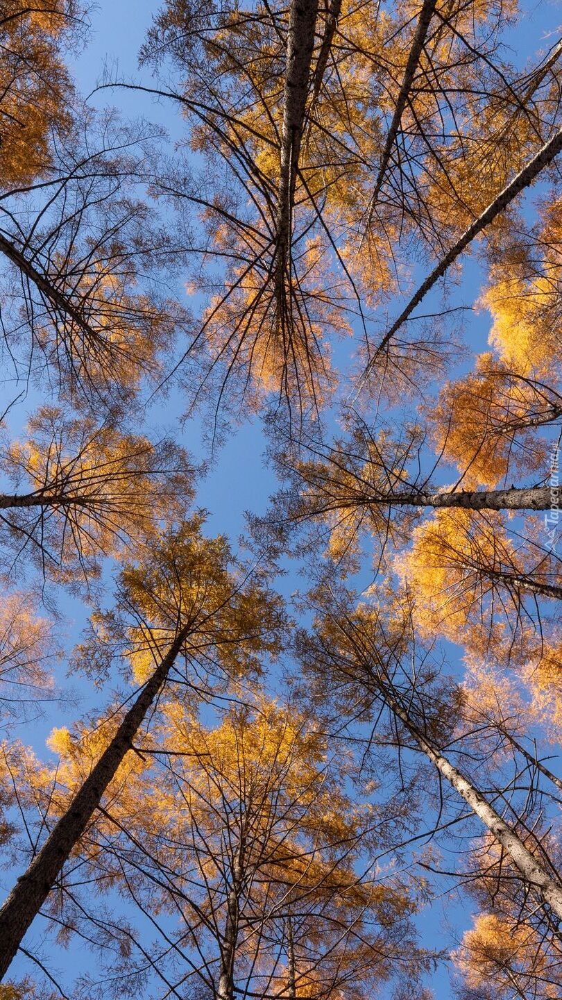 Edytor tapety: Wierzchołki rozświetlonych drzew na tle nieba