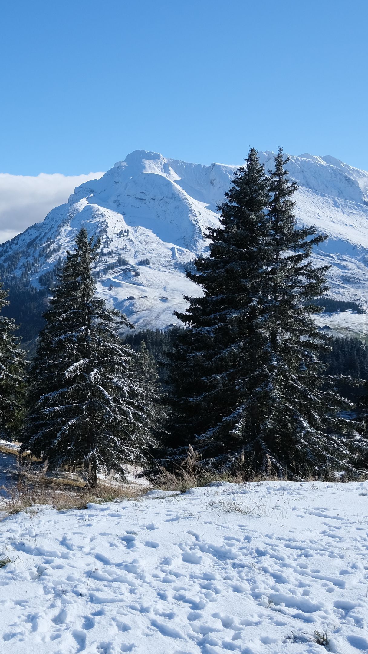 Edytor tapety: Drzewa na tle ośnieżonych gór