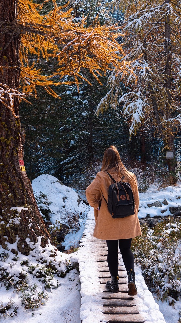 Edytor tapety: Dziewczyna na spacerze w zimowym lesie