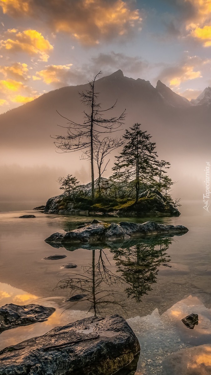 Edytor tapety: Drzewa na skałach na jeziorze Hintersee