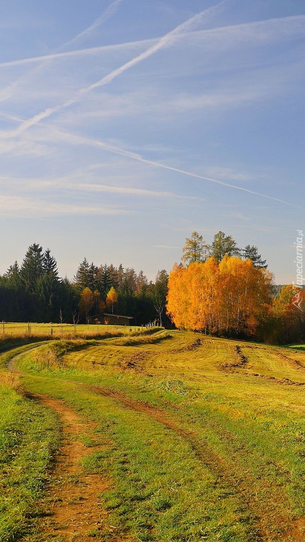 Edytor tapety: Rozświetlone jesienne drzewa na skoszonej łące