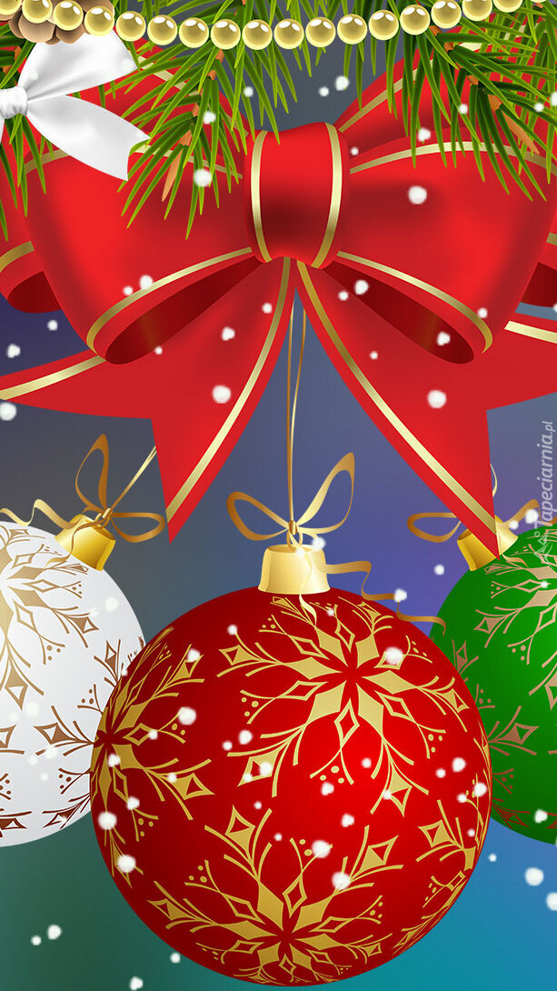 Edytor tapety: Bombki z czerwoną kokardą na gałązce