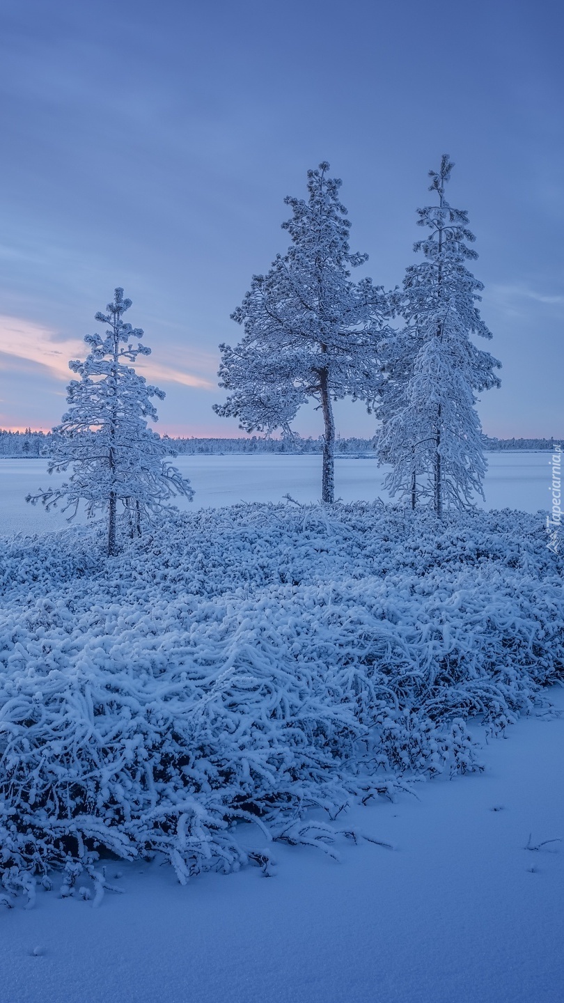 Edytor tapety: Ośnieżone drzewa i trawy na jeziorze