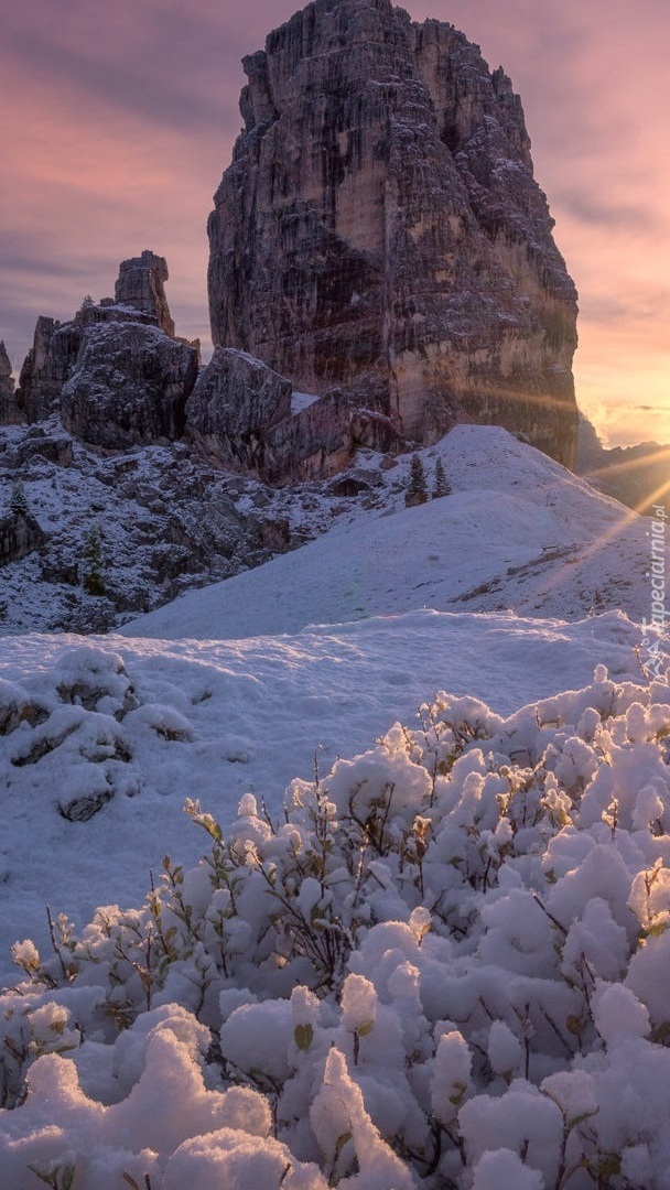 Edytor tapety: Zaśnieżone rośliny i szczyt Cinque Torri