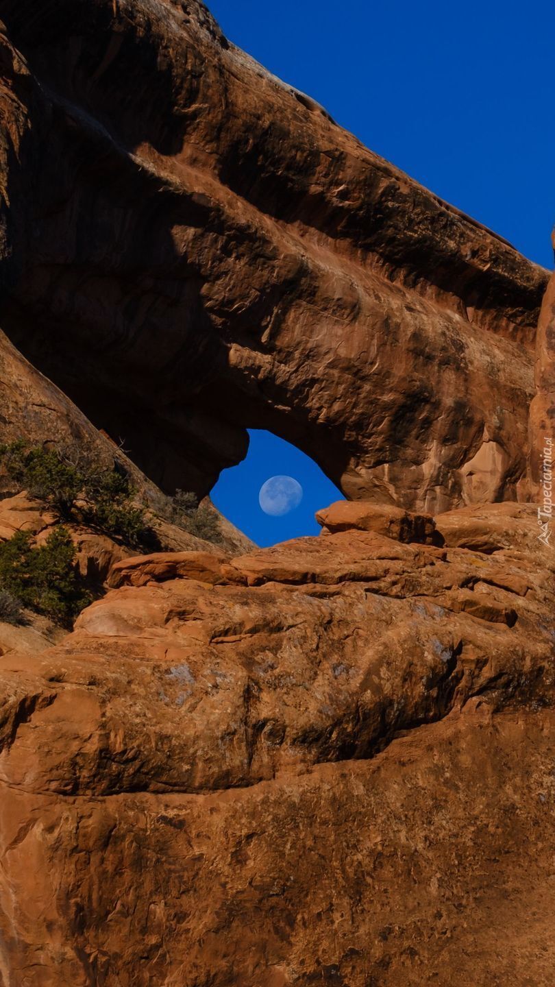 Edytor tapety: Księżyc na błękitnym niebie za skałami