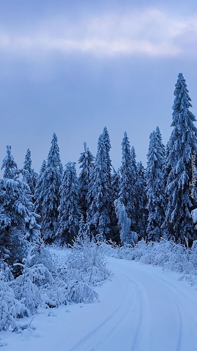 Edytor tapety: Zaśnieżona droga i drzewa w lesie